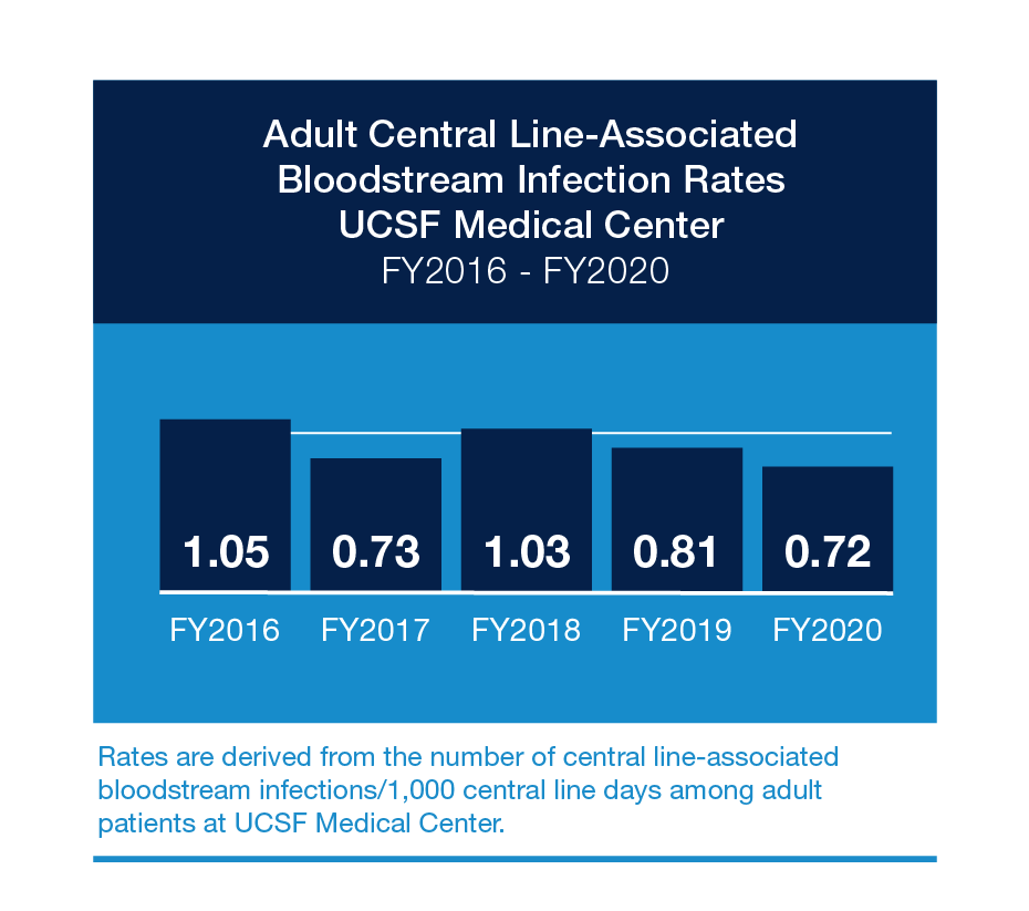 UCSF Medical Center measures these infection rates according to the methods of the National Healthcare Safety Network (NHSN) of the Centers for Disease Control and Prevention. The rate is expressed as the number of infections per 1,000 central line days (the total number of days patients have a central line in place). For example, if two patients had a central line for five days each, that is a total of 10 central line days.